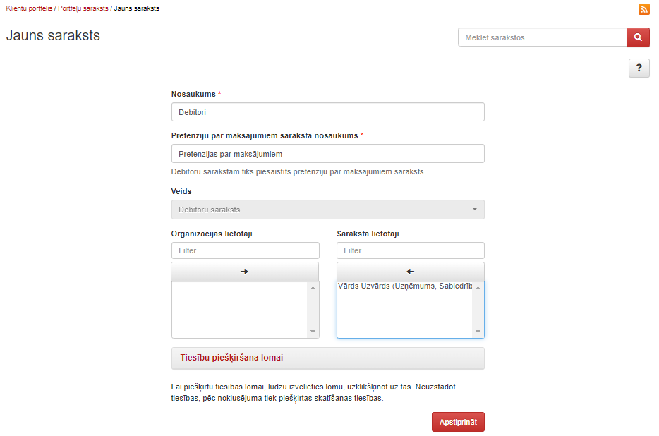 Saraksta izveidošanas formā pēc noklusējuma ir aizpildīts debitoru saraksta nosaukums un pretenziju par maksājumiem saraksta nosaukums, bet variet norādīt sev vēlamo nosaukumu abiem sarakstiem.