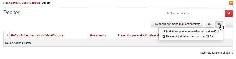 Debitoru sarakstam objektus var pievienot pa vienam, izvēloties izvēlnē Meklēt un pievienot uzņēmumu vai iestādi. Ja vēlaties sarakstā pievienot vairākus objektus, tad izvēlieties Pievienot juridiskas personas ar XLSX failu.