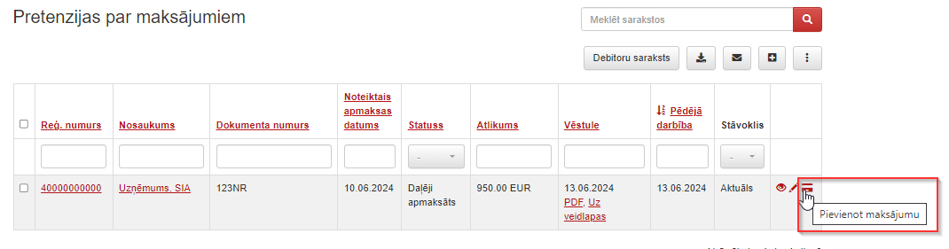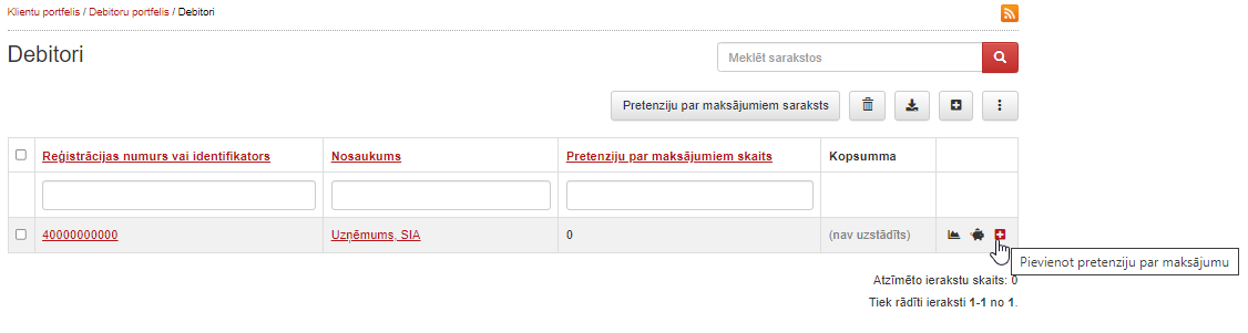 Lai sarakstā pievienotajam debitoram pievienotu pretenziju par maksājumu, nepieciešams izvēlēties iespēju Pievienot pretenziju par maksājumu.