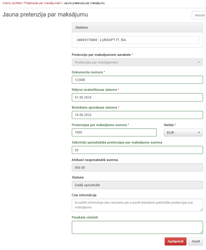 Pretenzijas ievienošanas formā nepieciešams aizpildīt datu laukus, ievadot vajadzīgo informāciju. Laukā Sākotnēji apmaksātās pretenzijas par maksājumu summa - jānorāda summa, ja debitors daļu no rēķina ir jau apmaksājis. Laukā Paraksts vēstulē norādāma informācija debitoram, kas tiks pievienota kā paraksts vēstulē debitoram.