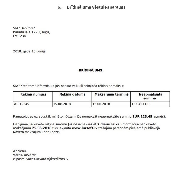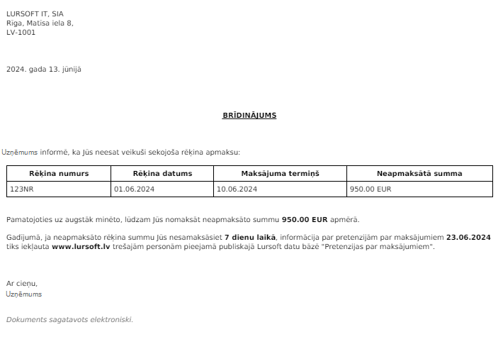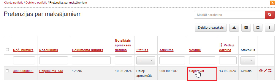 Pēc tam, kad ir ievadīti visi pretenzijas par maksājumu dati, nepieciešams ir izveidot brīdinājuma vēstuli debitoram. Lai izveidotu vēstuli ir jāizvēlas Sagatavot, pēc tam šī vēstule ir jānosūta debitoram pa pastu vai elektronisko pastu.