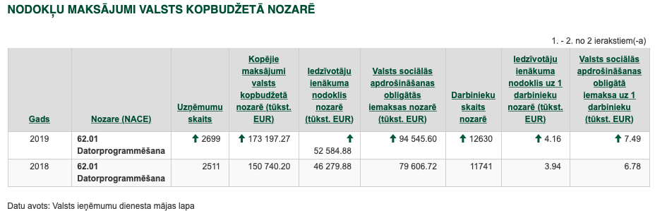 Lursoft dati liecina, ka datorprogrammēšanas nozarē strādājošie uzņēmumi 2019.gadā nodokļos valsts kopbudžetā iemaksājuši 173,20 milj.EUR, par 14,90% vairāk nekā 2018.gadā.